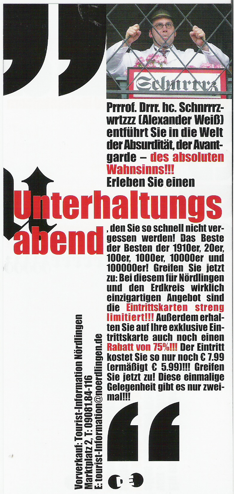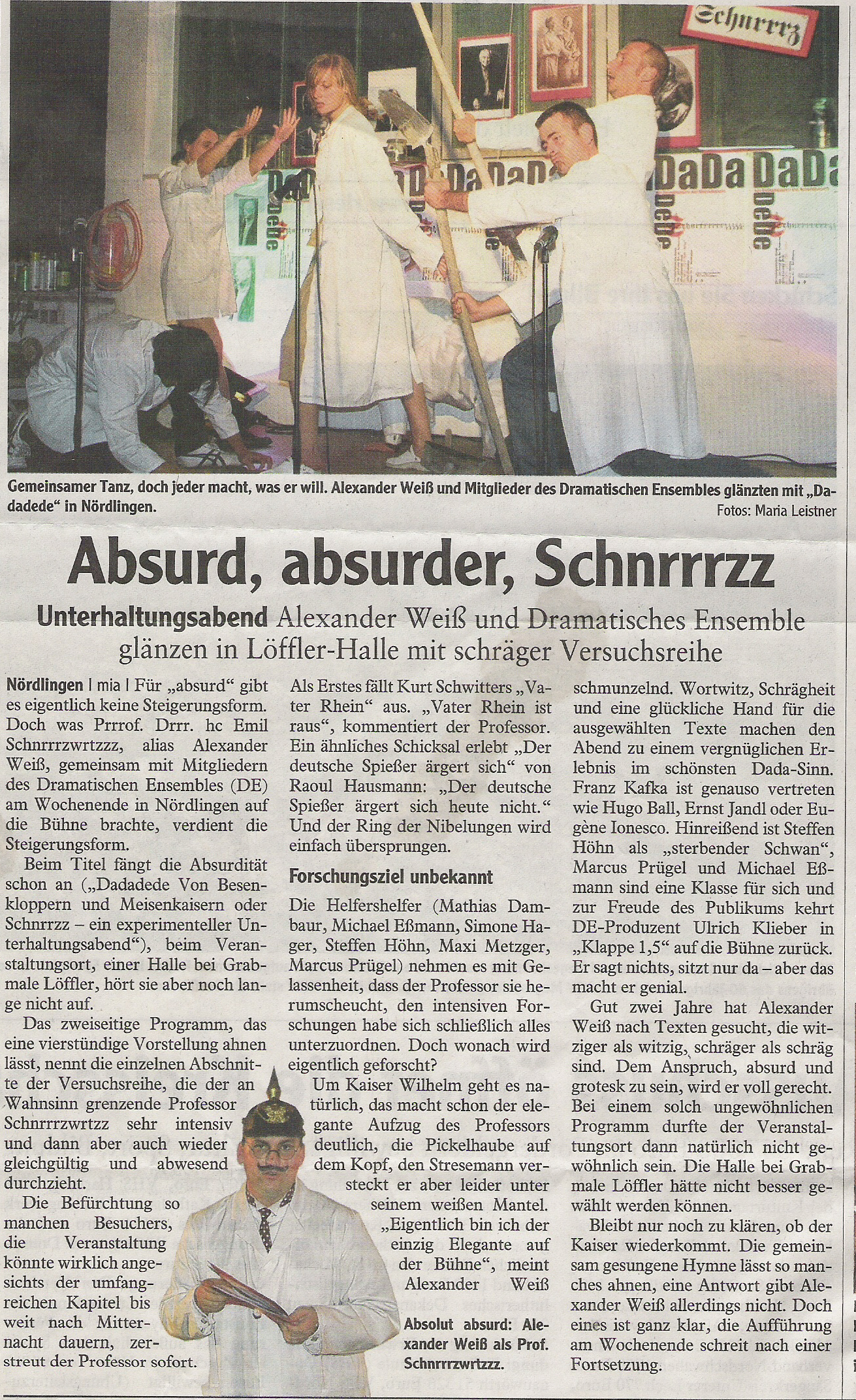 | Production DADADEDE | Employer / Theater Dramatisches Ensemble Nördlingen e.V. und Alexander Weiß | Part / Position Prrrof. Drrr. Drrr. Emil v. Schnrrrtznwrrrtz/ Regie & Produktion | Period 2008 |