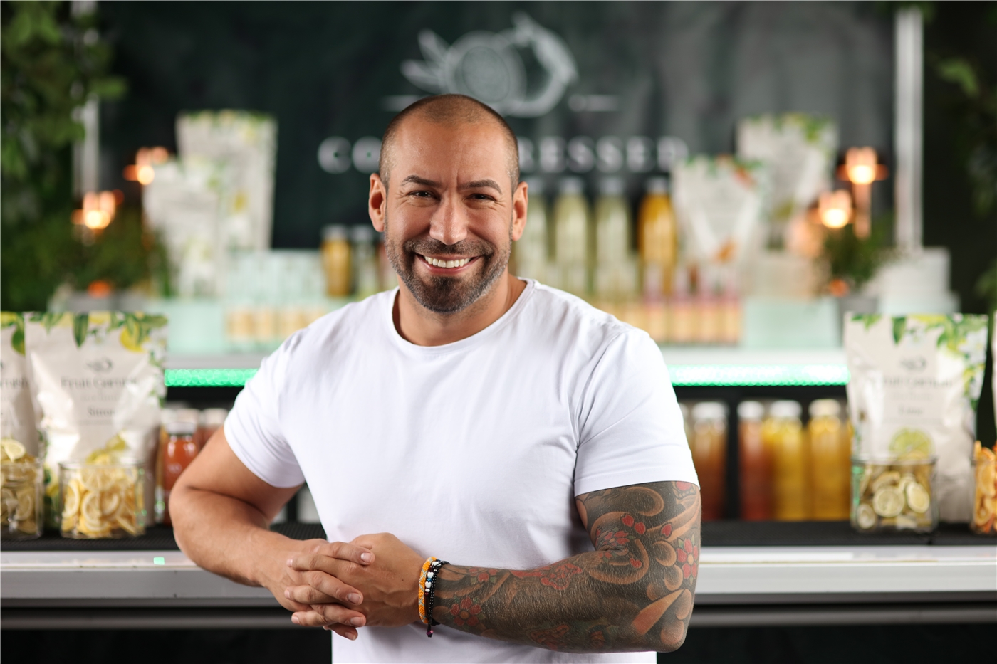 | Stort smil, tatuerad på hela vänsterarmen, brösten och höger sida (revben/rygg) |